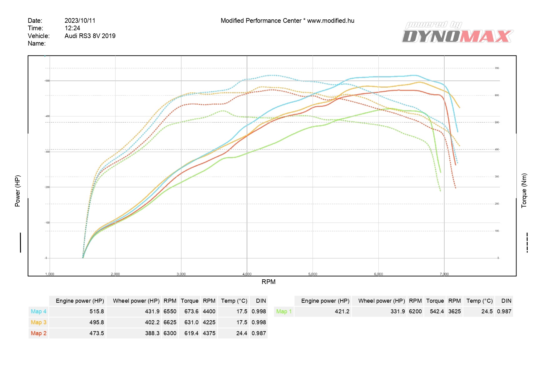 Példaként egy Audi RS3 8V2 DNWA álljon itt a különböző térképek mérési görbéivel. Ennél az autónál a 4. térkép 102 oktános benzinre vagy WMI használatára van írva.